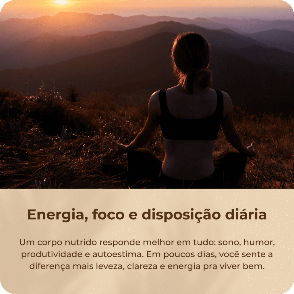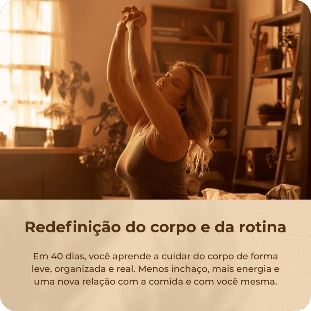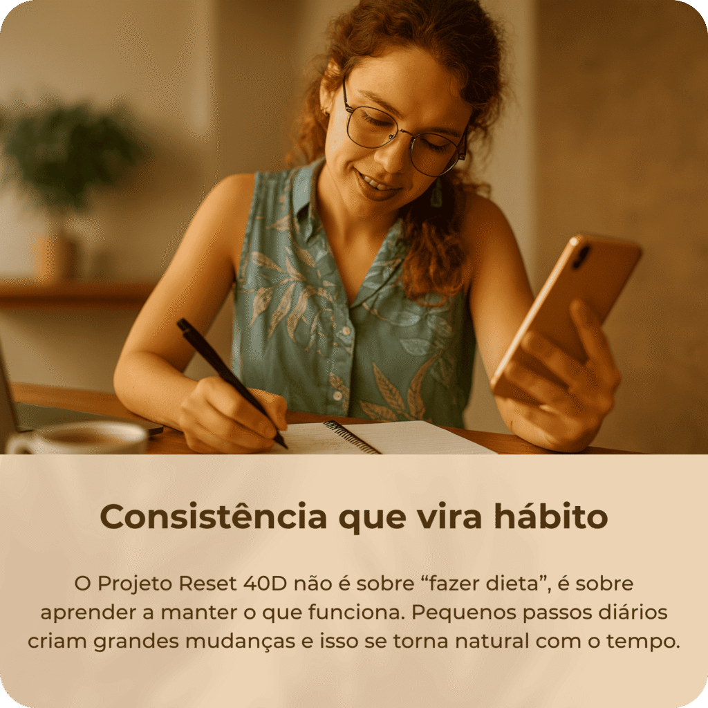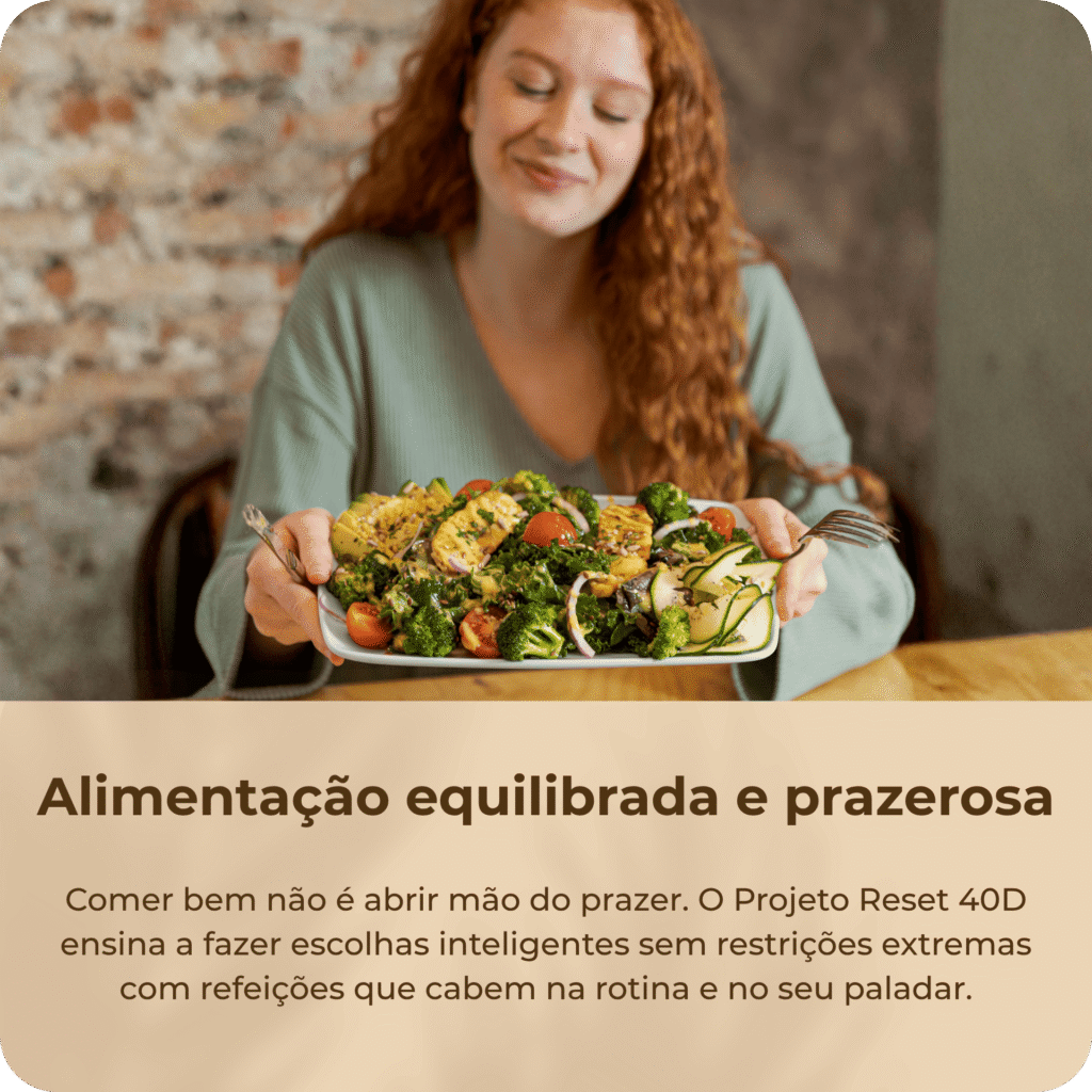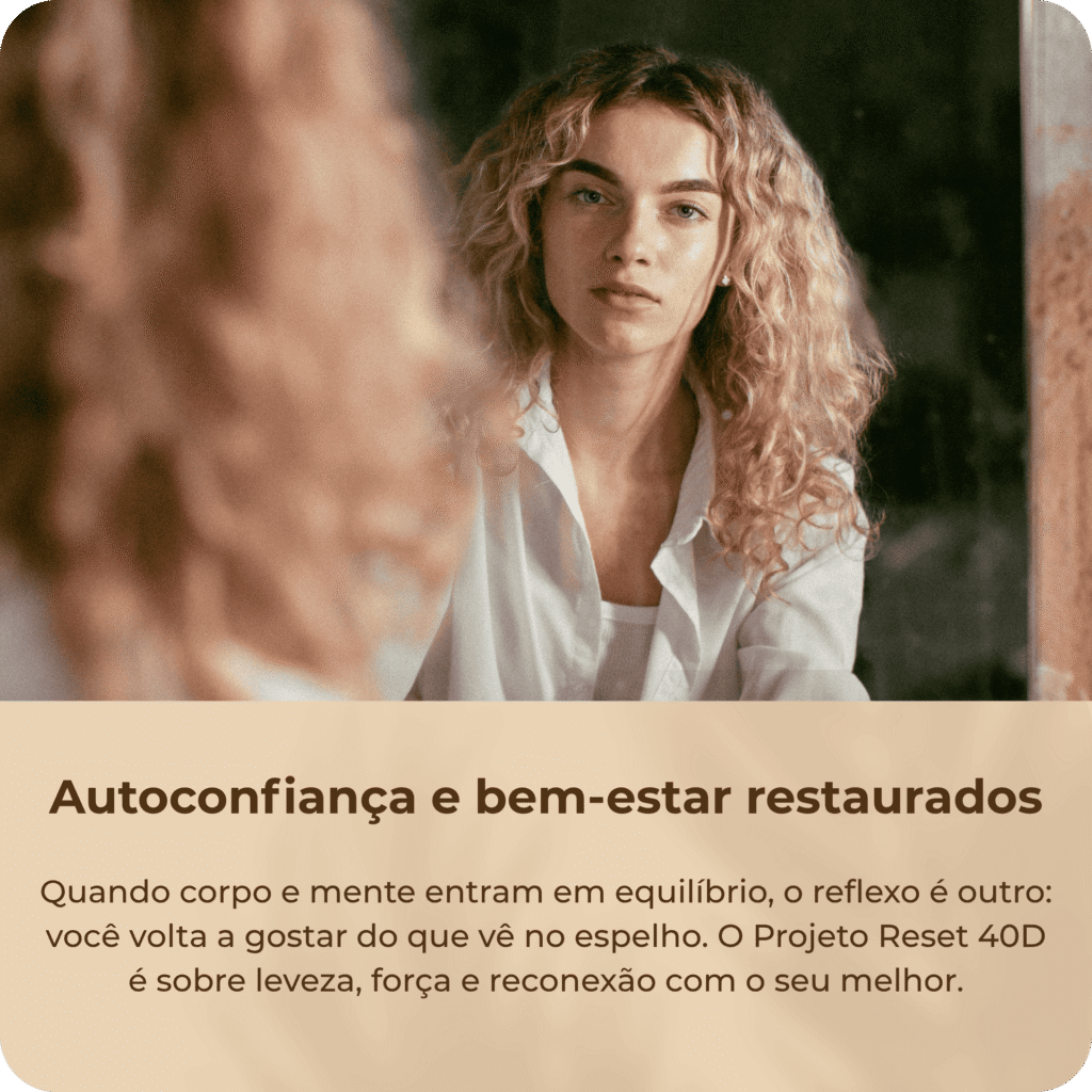 O PROJETO RESET 40D mostra um caminho diferente: ensina você a se reconectar com o seu corpo, a entender seus sinais e fazer escolhas inteligentes sem culpa e sem exageros.